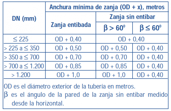 En la siguiente tabla podéis ver los anchos de zanja en función del diámetro exterior del tubo.