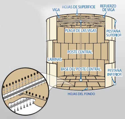 • Techos de acero cónicos con columna central de soporte para más fuerza en tanques con diámetros más grandes, eliminando el problema de que se caiga el techo por causa de fuertes vientos o peso de nieve.